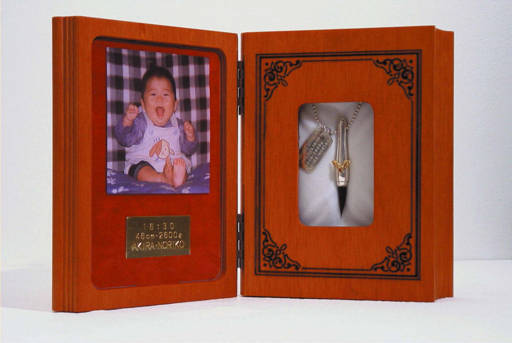 | ※ネームプレートには誕生日と名前を刻印します。 メモリーカードには出生時間・身長・体重・両親の名前が入ります。 写真はお客様が御自由にセットできます。 ペンダントトップにお生まれになった月の誕生石が入ります。 |