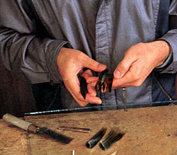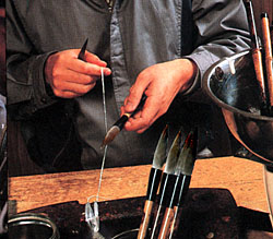 | 穂首の根元を麻糸できつく二重に巻いて止めた後、根元に焼きゴテをすばやく当てて焼き絞めます。これは、焼くことで根元の毛どうしをくっつけて、毛くずれを防ぐためと、筆軸に穂首をはめるために穂首の根元を平らに焼きそろえるために行います。 |